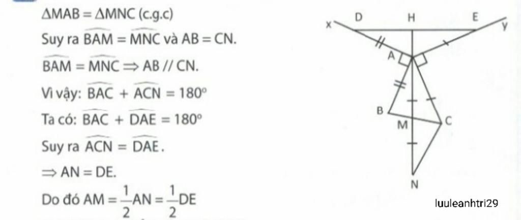 Cho tam giác ABC;góc A <90 độ, vẽ tia Ax vuông góc với AB (hai tia Ax và AC nằm trên cùng một mặt phẳng bờ là đường thẳng AB), trên tia Ax lấy điểm D sao cho AD = AB và vẽ tia Ay vuông góc với AC (hai tia Ay và AB nằm trên cùng một mặt phẳng bờ là đường thẳng AC), trên tia Ay lấy điểm E sao cho AE = AC. Gọi M là trung điểm của cạnh BC. Chứng minh: AM = DE/2