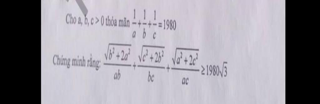 `⇒` `{\sqrt[b^2+2a^2]}/{ab}+{\sqrt[c^2+2b^2]}/{bc}+{\sqrt[a^2+2c^2]}/{ca}≥1980\sqrt[3]`