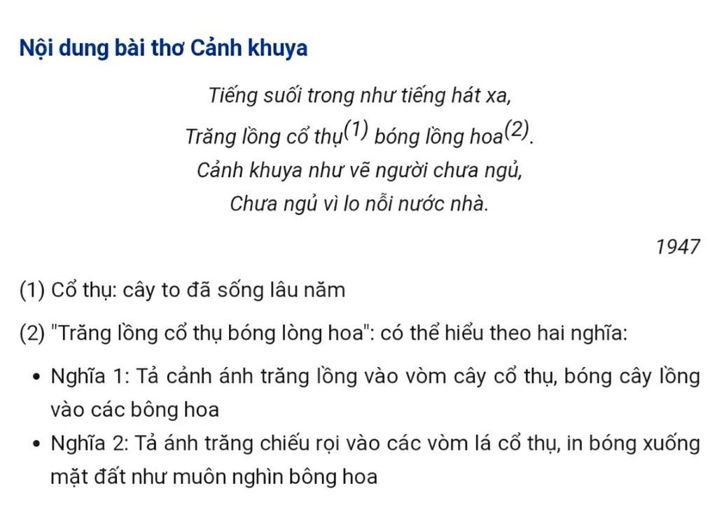 Một vẻ đẹp vừa đậm màu sắc dân gian vừa trang nghiêm cổ kính từ những câu chữ bình dị mà hàm súc. Cảnh này có hình vật, có ánh sáng và có âm thanh. Trên nền cảnh núi rừng Việt Bắc vắng vẻ, huyền ảo bởi ánh trăng lồng cổ thụ, tiếng suối thanh trong như điệu nhạc êm, hát mãi không ngừng. Câu thơ của Bác Hồ khiến ta nhớ lại Côn Sơn ca của Nguyễn Trãi: