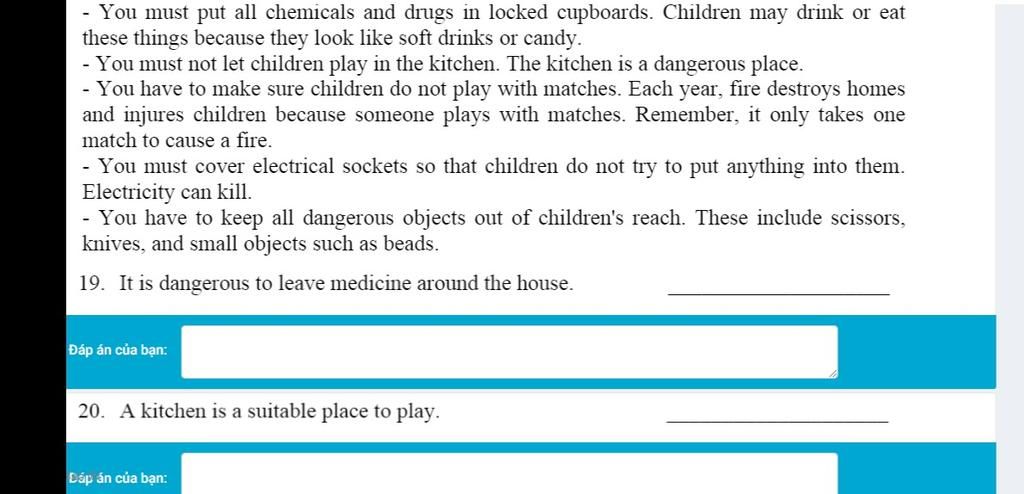 19. T (You must put all chemicals and drugs in locked cupboard. Children may drink and eat these things because they look like soft drinks or candy)