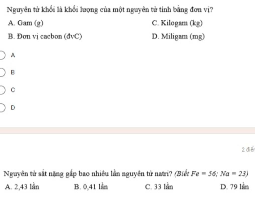 Nguyên tử sắt nặng gấp bao nhiêu lần nguyên tử natri? (Biết Fe = 56; Na = 23)