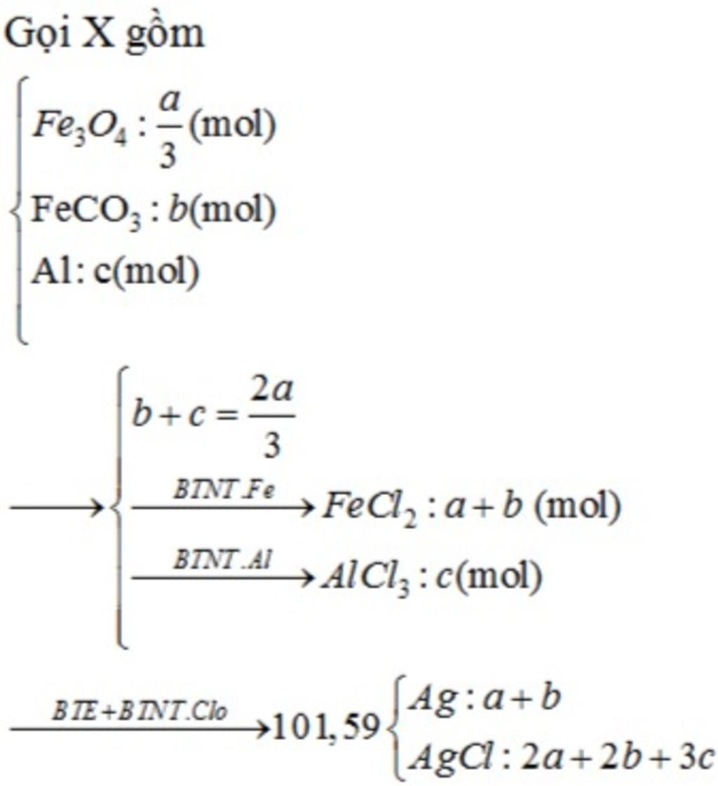 Cho hỗn hợp chất rắn X chứa Fe3O4, FeCo3,al(trong đó số mol của fe3o4 bằng 1/3 số mol X) tác dụng với 0,2479lit (đktc) khí o2 đun nóng ,kết thúc phản ứng chỉ thu được hôn hợp chất rắn Y và 0,2479 lít khí co2 . Cho Y phản ứng với hcl vừa đủ thu được 1,4874 lít hỗn hợp khí Z và dung dịch T chỉ chứa 2 muối. Cho Agno3 và dung dịch T , phản ứng sảy ra hoàn toàn thấy có 101,59g kết tủa. Biết các khí đó ở đkc. Tính khối lượng hỗn hợp chất rắn X.