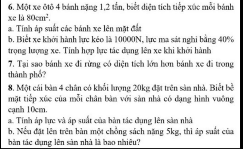 6. Một xe ôtô 4 bánh nặng 1,2 tấn, biết diện tích tiếp xúc mỗi bánh
