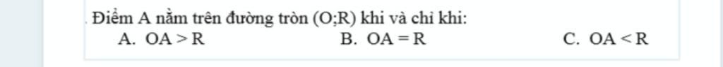 Đáp án C: OA < R khi điểm A nằm trong đường tròn (O; R)