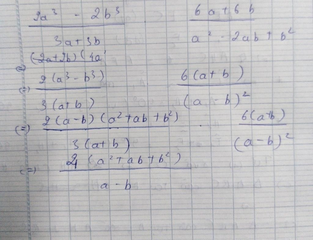 `=(2(a^3-b^3))/(3(a+b)).(6(a+b))/(a^2-2ab+b^2)`