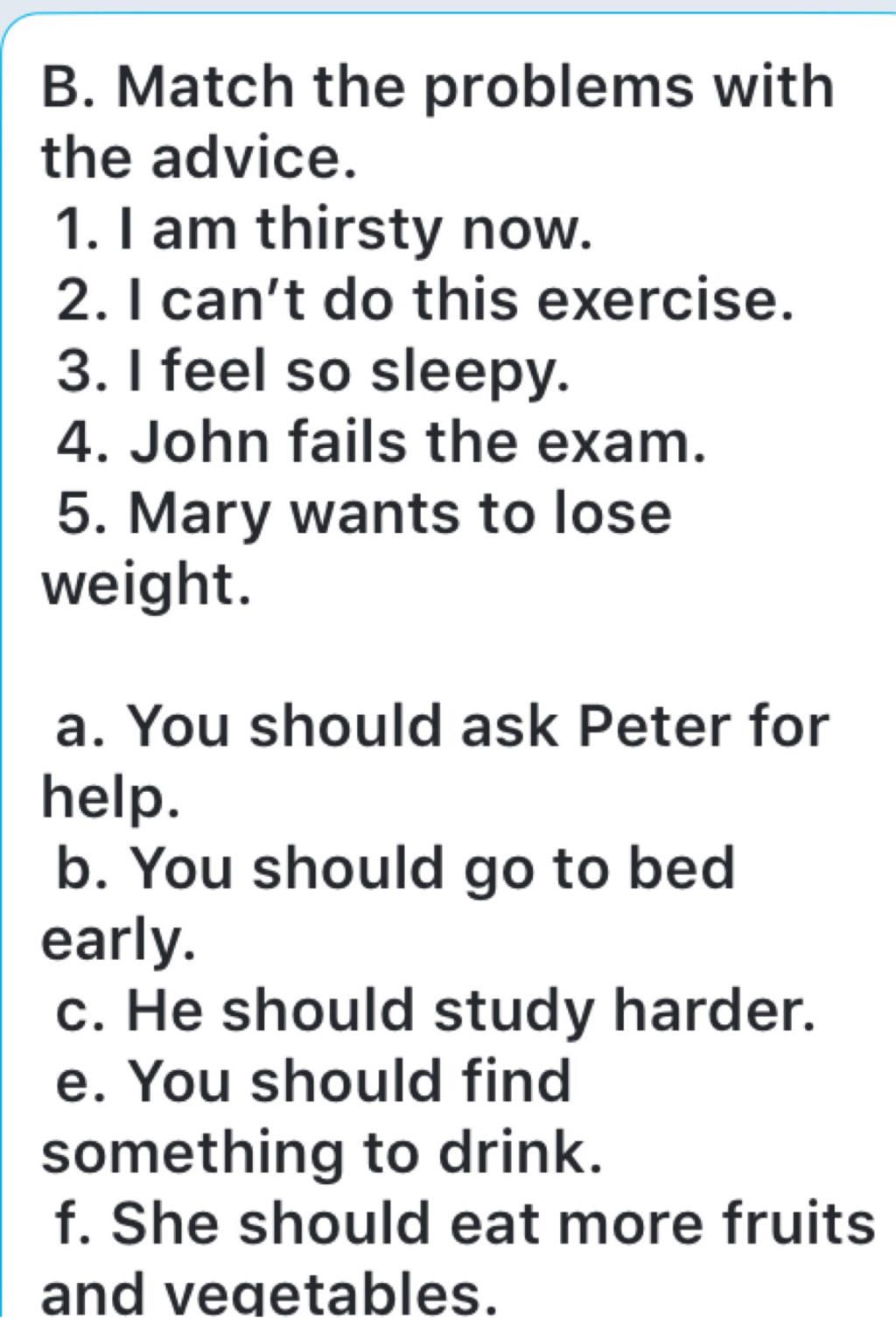 -> f. She should eat more fruits and vegetables (cô ấy nên ăn nhiều trái cây và rau củ quả)