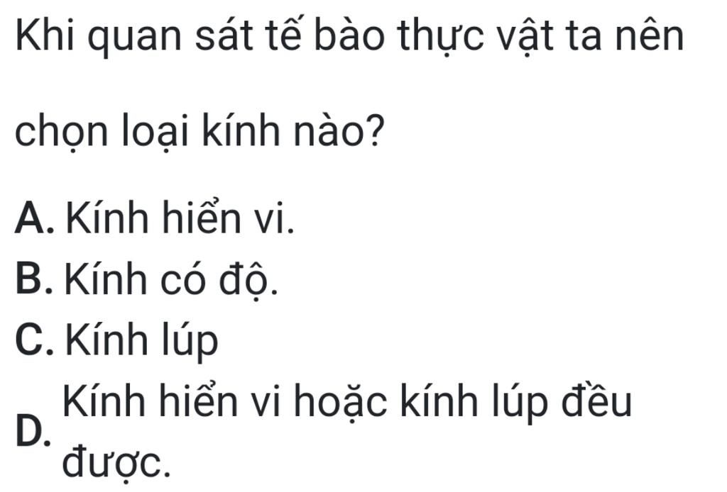 đáp án : d thì chỉ có kính hiển vi mới nhìn được nên loại d