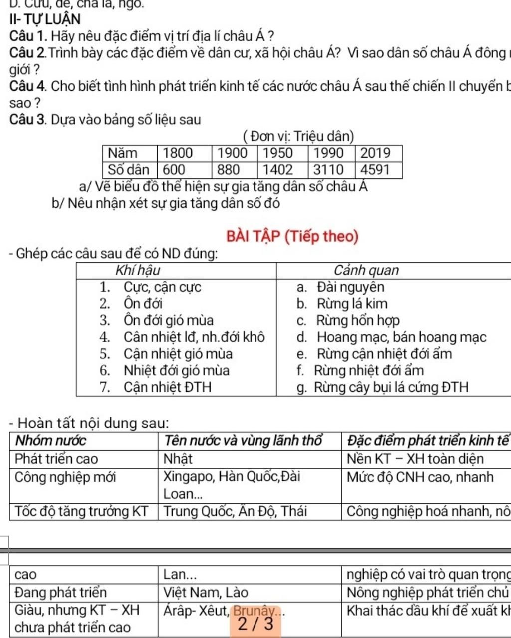 + Dân cư phân bố ko đều, tập chung chủ yếu ở vùng ven biển, ven sông như: Việt Nam, Ấn Độ, phía đông TQ,...do có địa hình bằng phẳng, khí hậu thuận lợi. Thưa thớt ở vùng cực và nội địa như: phía tây TQ, I-rác, Ả-rập-xê-út,...do có địa hình hiểm trở, khí hậu khô hạn, lạnh giá.