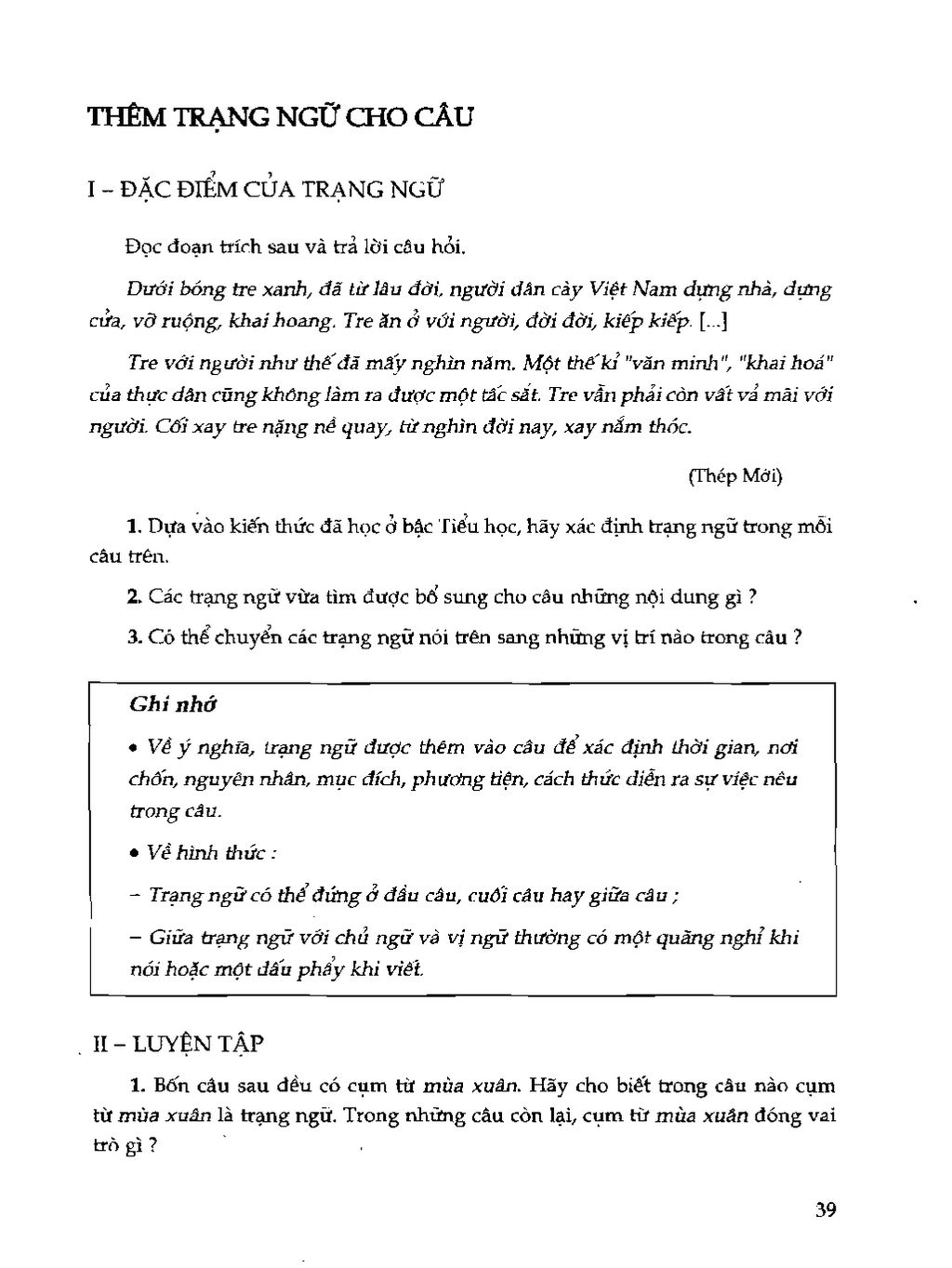 + Trạng ngữ là thành phần phụ của câu, bổ sung ý nghĩa cho thành phần chính và là bộ phận của câu xác định thời gian, nơi chốn, nguyên nhân,… của sự việc nêu trong câu.