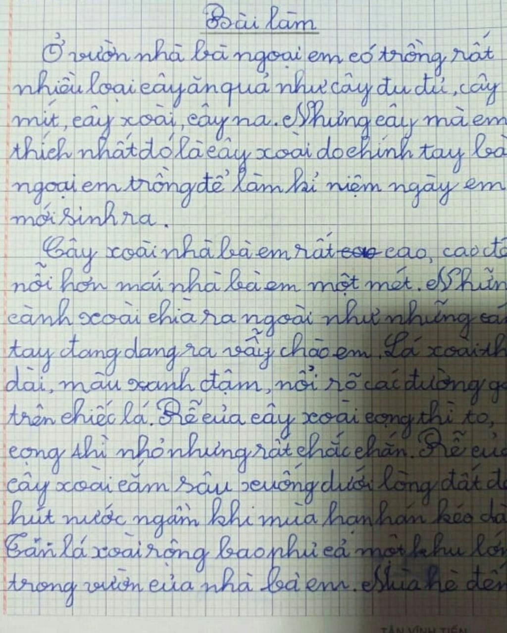 Cành cây khẳng khiu, vươn dài ra các phía đón nắng mặt trời. Tán lá xum xuê tạo thành bóng mát cho chúng em ngồi chơi. Lá xoài to, dài bằng bàn tay người lớn, mặt trên xanh đậm, mặt sau xanh nhạt, mặt lá nổi rõ từng đường gân. Lá xum xuê, xếp lại thành tán dày khiến ánh nắng lọt qua chỉ còn là màu xanh ngọc bích. Đến mùa, cây xoài như được khoác một chiếc áo mới nhờ sự tô điểm của hoa.