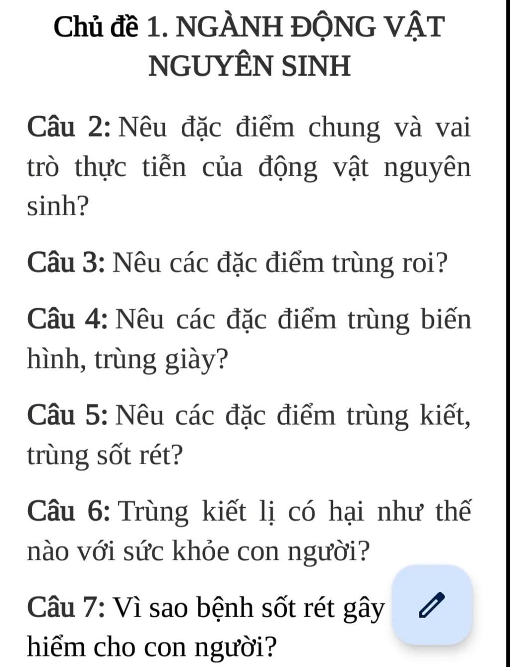 câu 2 Đặc điểm chung của động vật nguyên sinh vừa đúng cho loài sống tự do lẫn loài sống kí sinh là: ... – Cơ thể chỉ có cấu tạo 1 tế bào nhưng đảm nhiệm mọi chức năng sống. – Sinh sản vô tính theo kiểu phân đôi. – Phần lớn: dị dưỡng; di chuyển bằng chân giả, lông bơi hoặc roi bơi, một số không di chuyển.