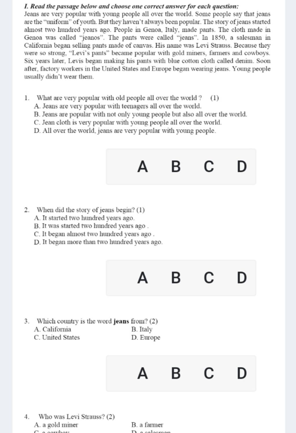 Jeans are very popular with young people all over the world. Some people say that jeans