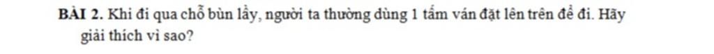 $\text{ ⇒ Khi đi trên đó thì áp suất gây ra trên mặt bùn được giảm đi ⇒ mặt bùn đỡ bị lún so với khi không có ván.}$