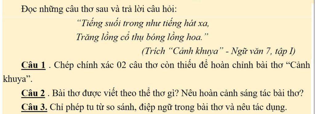 Câu 2: Thể thơ thất ngôn tứ tuyệt. Hoàn cảnh là ở chiến khu VIệt Bắc, trong thời kì đầu kháng chiến chống thực dân Pháp.