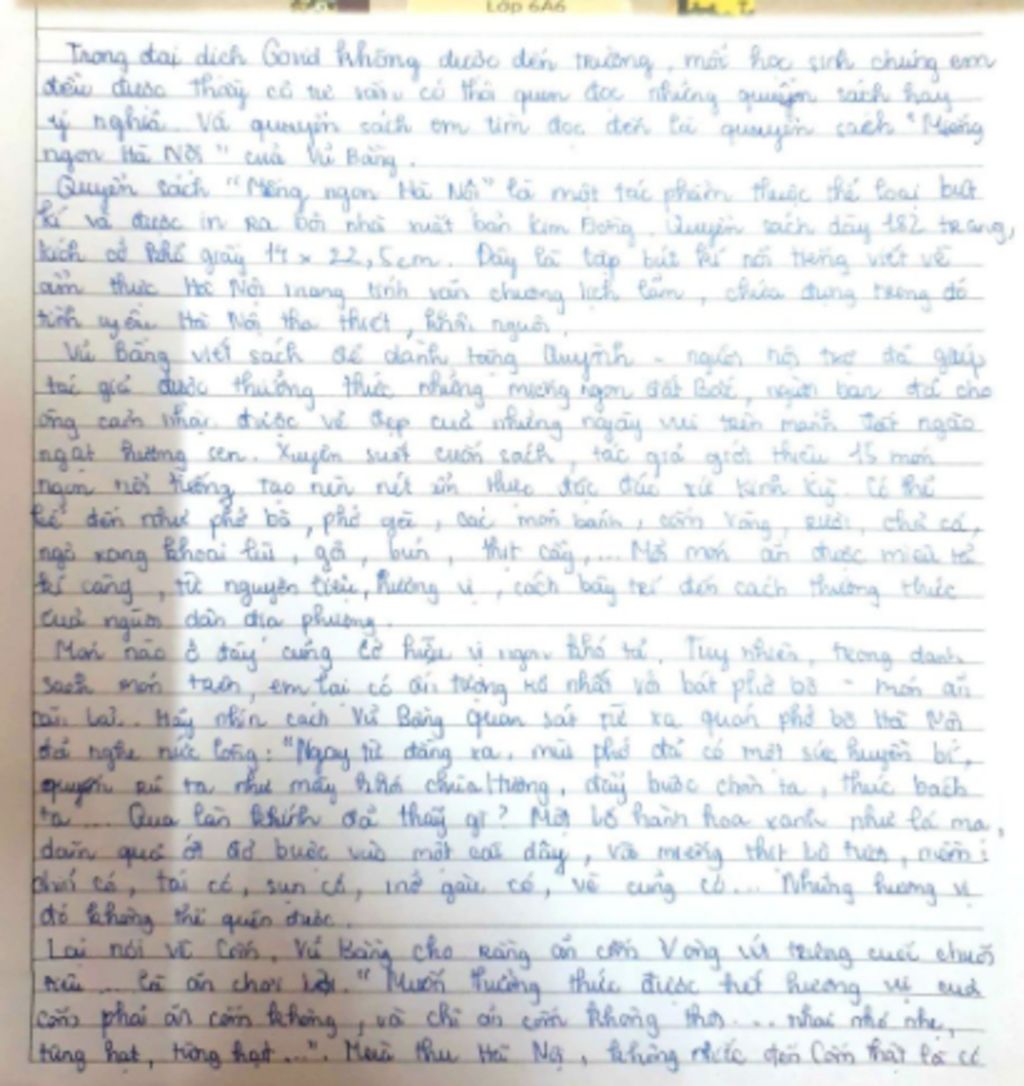 hộ em vs ạ: Viết bài cảm nhận về quyển sách Món ngon Hà Nội của Vũ Bằng ạ, ai biết phong trào triển lãm mà viết bài này roi thì giúp em vs ạ. BÀI LÀM Xuyên sốt cuốn sách, 15 món ngon nức tiếng, mang đậm nét ẩm thực độc đáo của xứ Bắc Việt đã được Vũ Bằng mô tả chăm chút, kỹ lưỡng, từ nguyên liệu, cách bài trí, đến cách ăn, cách thưởng thức của người dân ở vùng đất này. Đó là các món mà bao thế hệ người Hà Nội đều mê, đều thèm. Đầu bảng là phở bò, rồi phở gà, bánh cuốn, bánh đúc, bánh khoái, bánh Xuân Cầu, cốm Vòng, rươi, ngô rang, khoai lùi, gỏi, quà bún, chả cá, thịt cầy, tiết canh cháo lòng, hẩu lốn! Tất cả đã làm nên diện mạo ẩm thực Hà Nội, làm nên hương vị cuộc sống truyền đời.