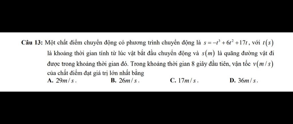 Dựa vào BBT $\Rightarrow \underset{[0;8]}{max \ }v=29(m/s).$