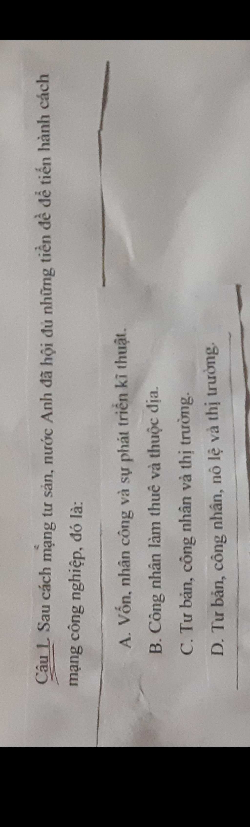 ⇒Vì sau cách mạng tư sản, nước Anh đã hội tụ những tiền đề để tiến hành cách mạng công nghiệp là tư bản, nhân công và thị trường.