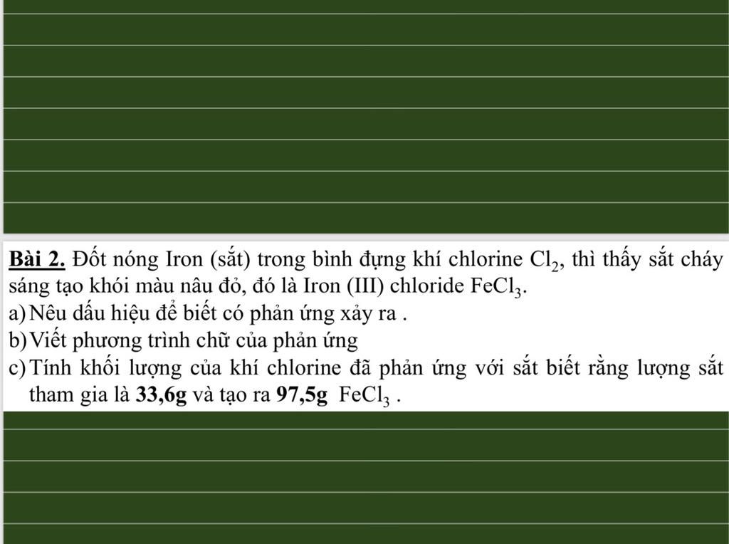 `b.` PT chữ: iron + khí chlorine $\xrightarrow{t^o}$ iron (III) chloride