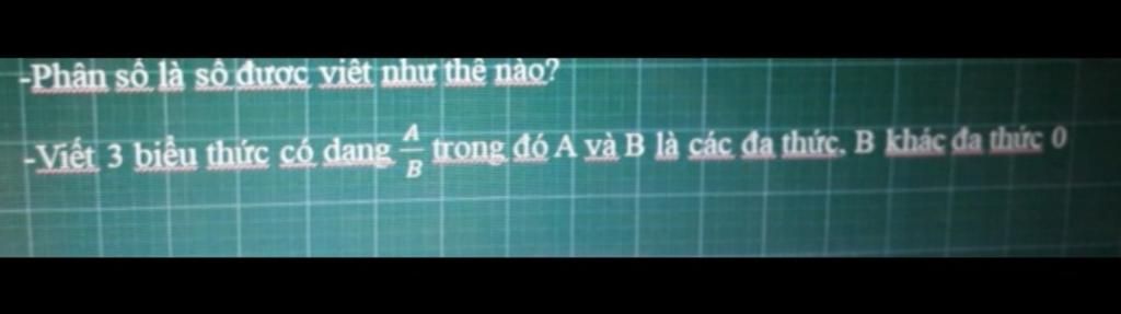 - `3` biểu thức có dạng `A/B` trong đó `A` và `B` là những đa thức, `B` khác đa thức `0` là: `(2x^2y)/(6x^2)` ; `(7y)/(8x)` ; `(3xyz)/(2ax)`