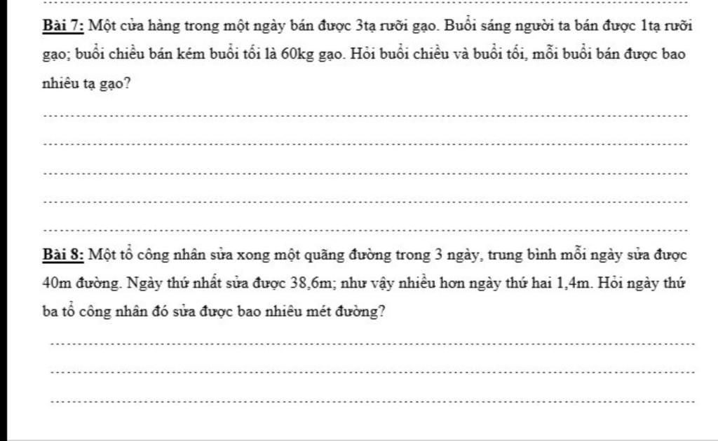 Tổng số `m` đường `3` ngày là: `40xx3= 120(m)` Số `m` đường ngày thứ `2` sửa là: `38,6-1,4= 37,2(m)` Số `m` đường ngày thứ `3` là: `120-(38,6+37,2)= 44,2(m)` Đáp số:...