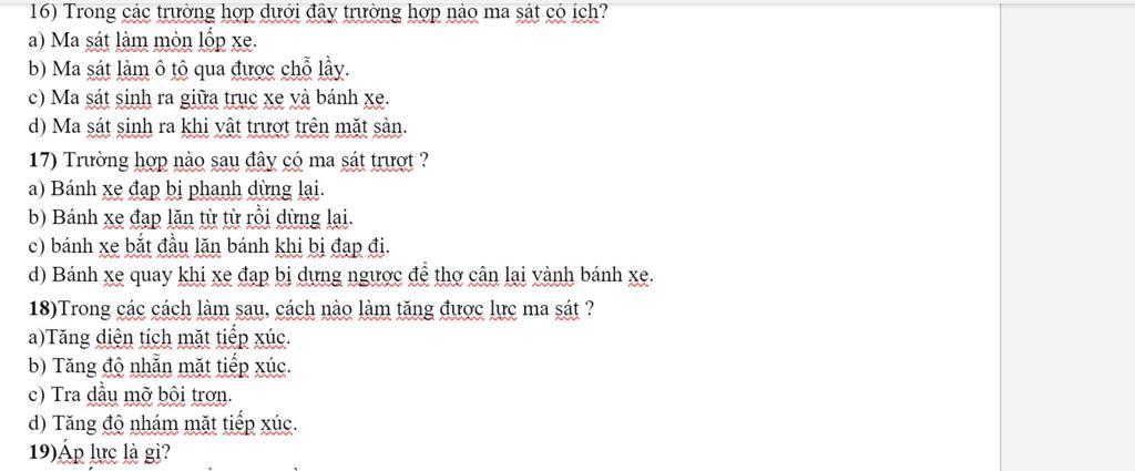 d) tăng đô nhám của vật⇒sẽ tăng được lực ma sát trượt vì sẽ làm cho vật đó khó mà trượt trên mặt vật khác.