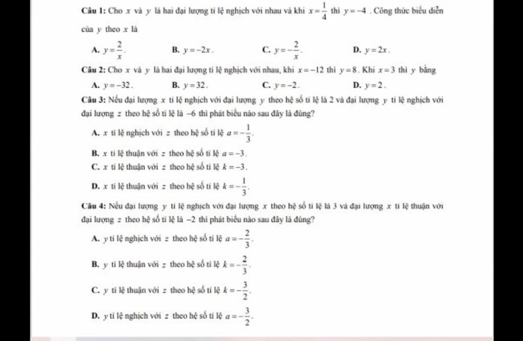 Câu 2: Cho x và y là hai đại lượng ti lệ nghịch với nhau, khi x=-12 thì y= 8. Khi x= 3 thì y bằng