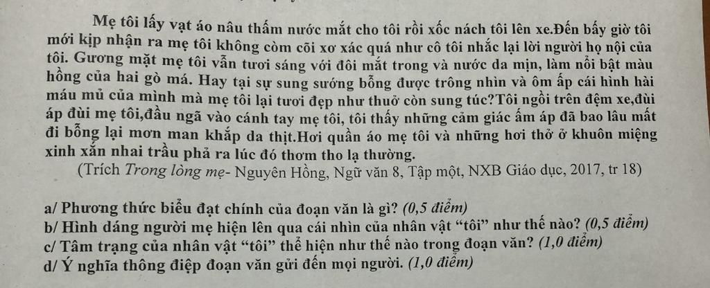 Gương mặt mẹ tôi vẫn tươi sáng với đôi mắt trong, và nước da mịn làm nổi bật màu hồng của hai gò má. Hay tại sự sung sướng bỗng được trông nhìn và ôm ấp cái hình hài máu mủ của mình mà mẹ tôi lại tươi đẹp như thuở còn sung túc?