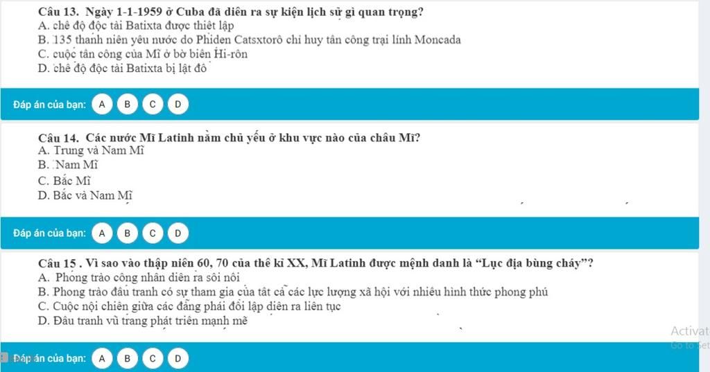 15. D. Đấu tranh vũ trang phát triển mạnh mẽ ( tiêu biểu là Cuba, Pêru,...)