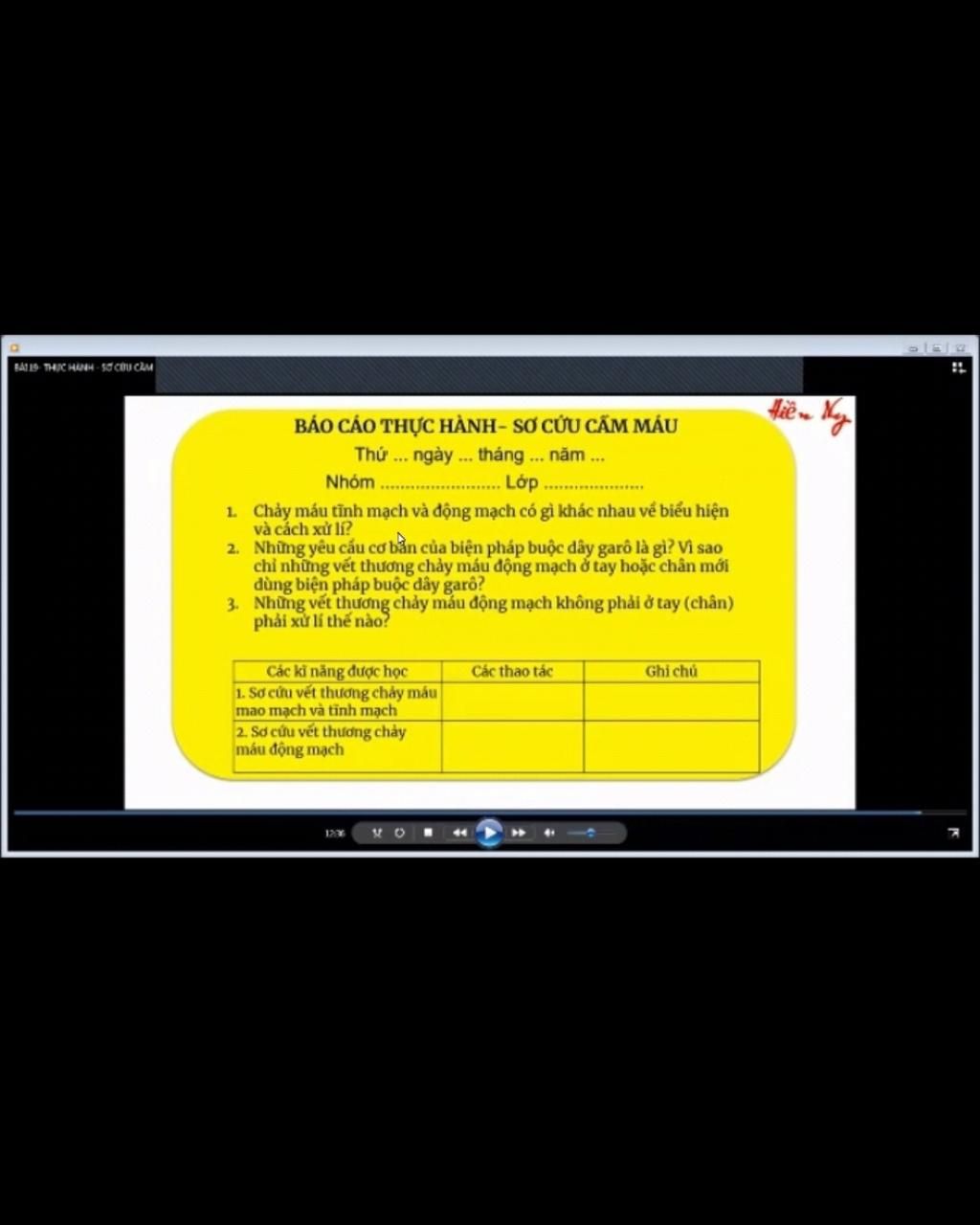 Các kĩ năng được học+Các thao tácGhi chú. Sơ cứu vết thương chảy máu mao mạch và tĩnh mạch