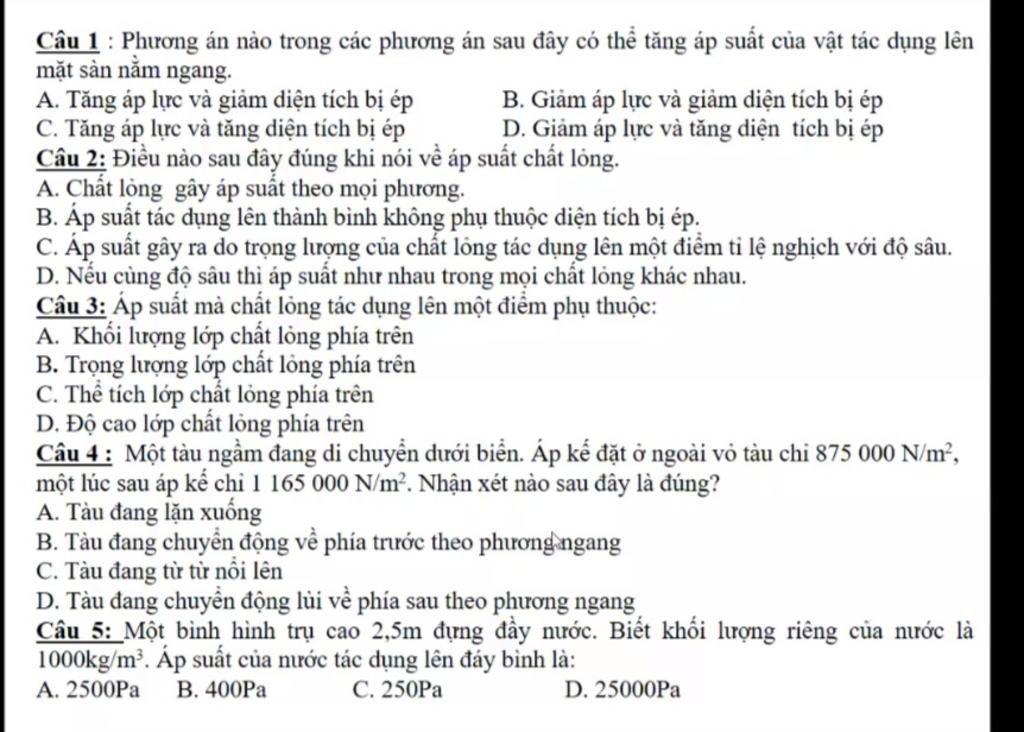 Câu 1.A vì muốn tăng áp suất, ta phải tăng áp lực và giảm diện tích