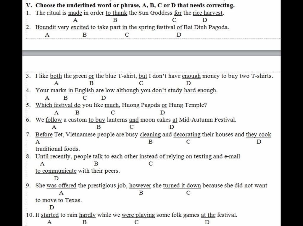 V. Choose the underlined word or phrase, A, B, C or D that needs correcting.
