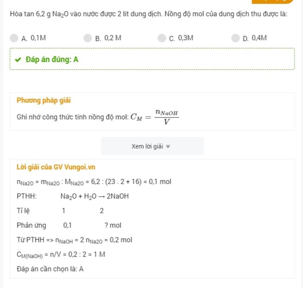 Từ phương trình phản ứng ta thấy cứ 1 mol Na2O phản ứng với một mol H2O thì tạo ra 2 mol NaOH ( Tỉ lệ 1:1:2 ) nên khi có số MOL của 1 trong 3 chất trên ta có thể lấy số mol đề bài cho chia cho số đứng trước nguyên tố đó trong phương trình phản ứng rồi nhân với số đứng trước chất cần tìm