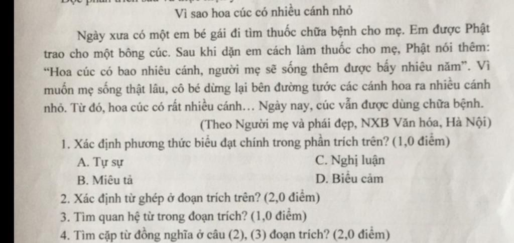 từ ghép : ngày xưa , một em bé , chữa bệnh , một bông cúc , hoa cúc , người mẹ , cô bé , bao nhiêu , cánh nhỏ , ngày nay , chữa bệnh , nói thêm , cánh hoa