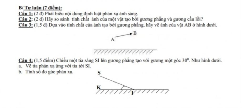 Câu 1 : Nội dung định luật phản xạ ánh sáng. - Khi ánh sáng bị phản xạ, tia phản xạ sẽ nằm trong mặt phẳng chứa tia tới và pháp tuyến của gương ở điểm tới. - Góc phản xạ sẽ bằng góc tới.