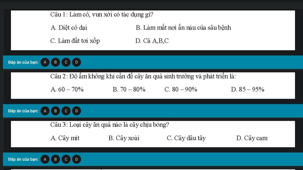 Câu 2: Độ ẩm không khí cần đế cây ăn quả sinh trưởng và phát triển là: