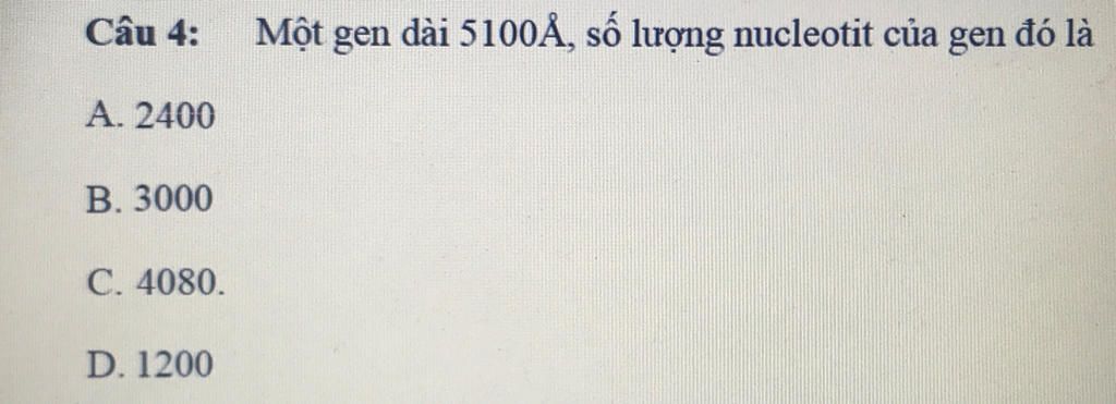 Câu 4: Một gen có chiều dài 5100Å, số lượng nucleotit của gen đó là:
