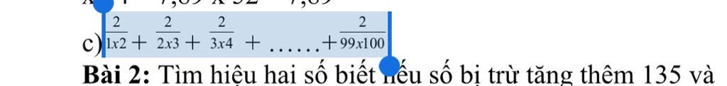 $\frac{2}{1*2}$ $+$ $\frac{2}{2*3}$ $+$ $\frac{2}{3*4}$ $+$ $...........$ $+$ $\frac{2}{99*100}$
