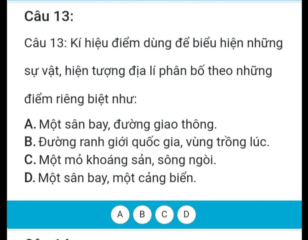 Câu 13: kí hiệu điểm dùng để biểu hiện những sự vật, hiện tượng địa lí phân bố theo những điểm riêng biệt như: