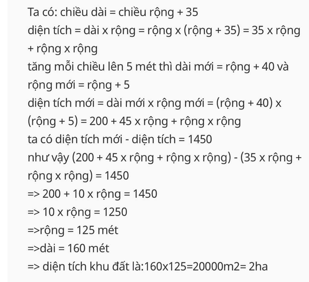 Diện tích sau khi tăng mỗi chiều `:` `(` `a` `+` `5` `)` `xx` `(` `a` `+` `35` `+` `5` `)` `=` `(` `a` `+` `5` `)` `xx` `(` `a` `+` `40` `)`