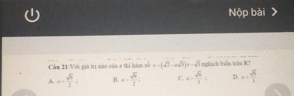 Ta có : `y=(\sqrt[2]-a\sqrt[3])x-\sqrt[3]` nghịch biến khi :