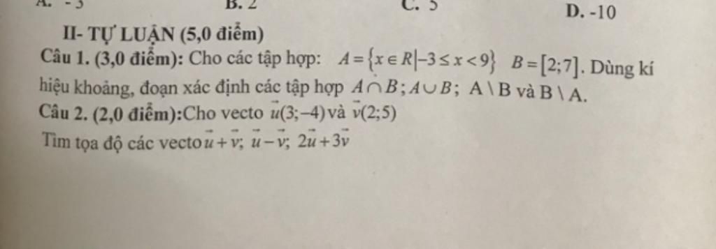 Câu 1. (3,0 điểm): Cho các tập hợp: 4= {x e R|-35x<9} B = [2;7]. Dùng kí