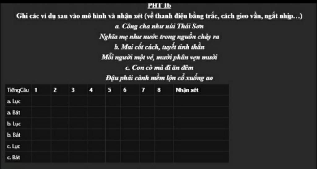 Ghi các ví dụ sau vào mô hình và nhận xét (về thanh điệu bằng trắc, cách gieo vần, ngắt nhịp...)