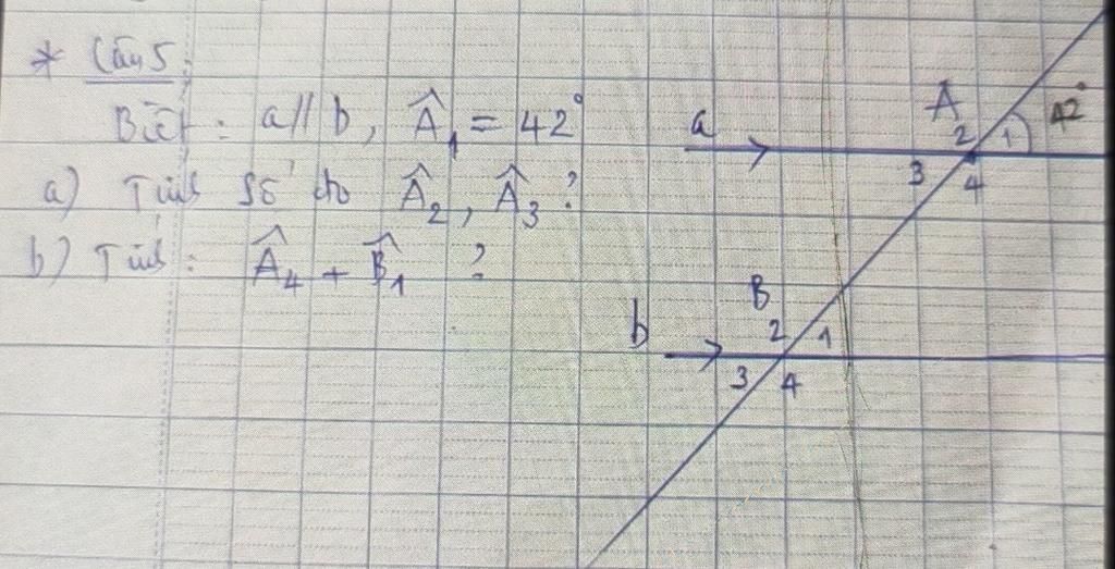 a) Có: $\widehat{A1}$ = $\widehat{A3}$ = $42^o$ (2 góc đối đỉnh)