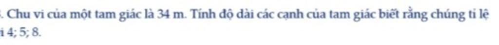 Vì `3` cạnh của tam giác tỉ lệ thuận với chu vi tam giác nên theo đề ta có: `a/4=b/5=c/8` và `a+b+c=34`