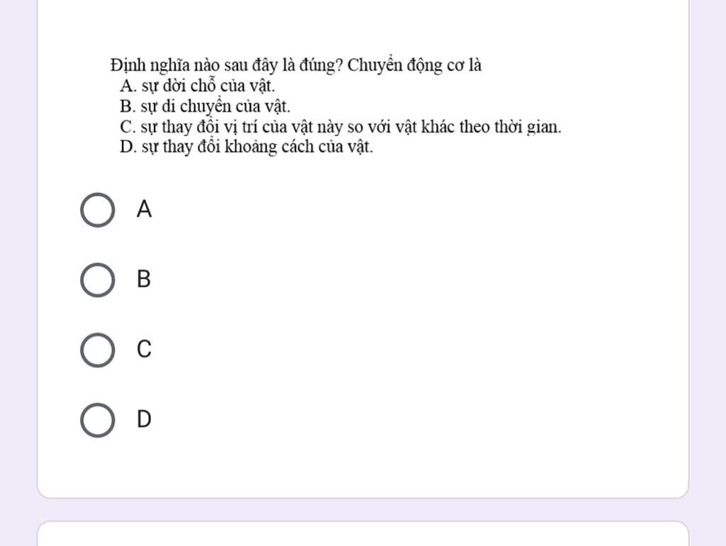 → C. sự thay đổi vị trí của vật đó so với các vật khác theo thời gian.