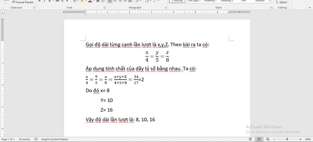 `x/4=y/5=z/8` và `x+y+z=34m`