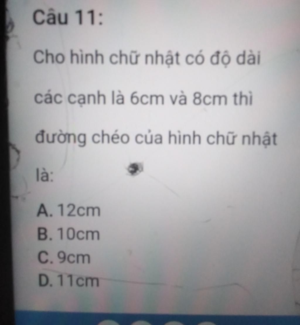 Cho hinh chu nhat co do dai cac canh la 6cm va 8cm thi duong cheo cua hinh chu nhat la: