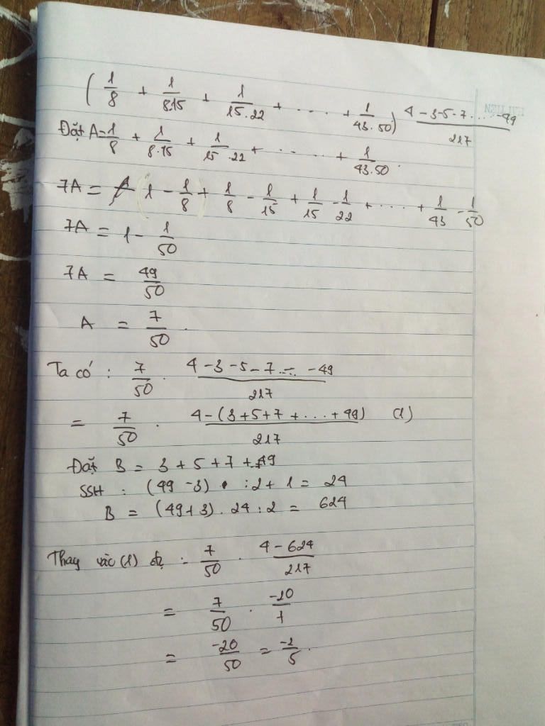 `=`\(\frac{1}{7}.\left(\frac{7}{1.8}+\frac{7}{8.15}+\frac{7}{15.22}+...+\frac{7}{43.50}\right)\cdot\frac{4-\left(3+5+7+...+49\right)}{217}\)