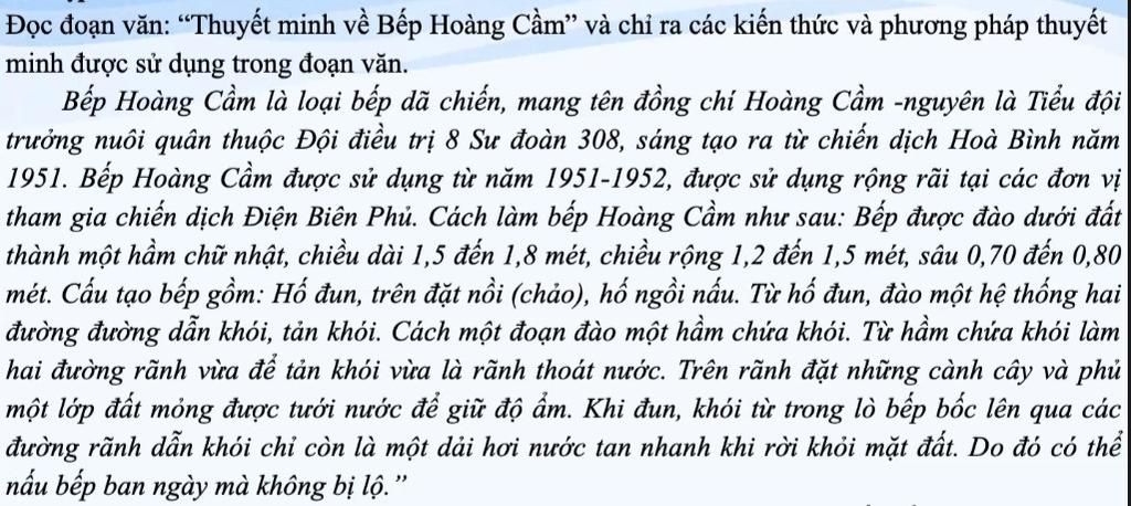 Đọc đoạn văn: “Thuyết minh về Bếp Hoàng Cầm" và chỉ ra các kiến thức và phương pháp thuyết