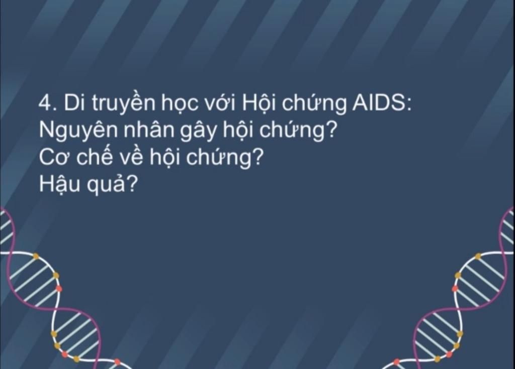 - nguyên nhân gây hội chứng AIDS: do virut HIV gây nên , lây truyền qua quan hệ tình dục, sử dụng kim bị nhiễm HIV trước đó hoặc truyền máu bị nhiễm HIV, truyền từ mẹ sang bào thai hoặc truyền qua em bé mới sinh và bú sữa mẹ.
